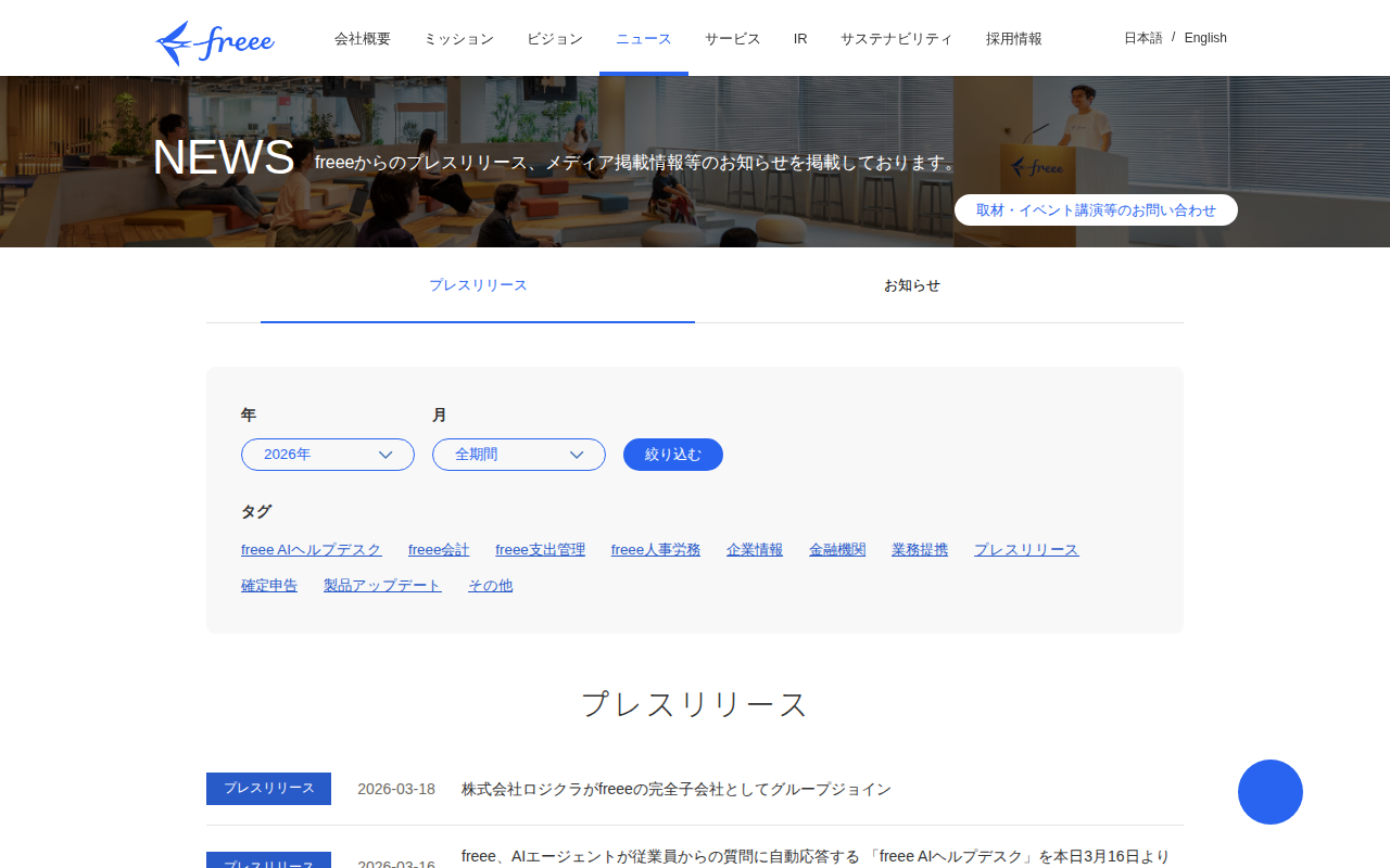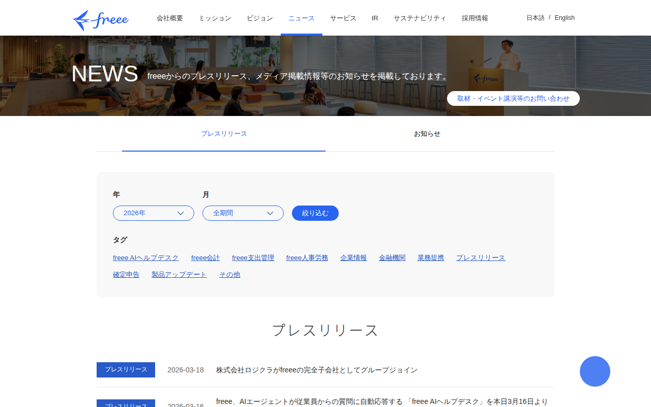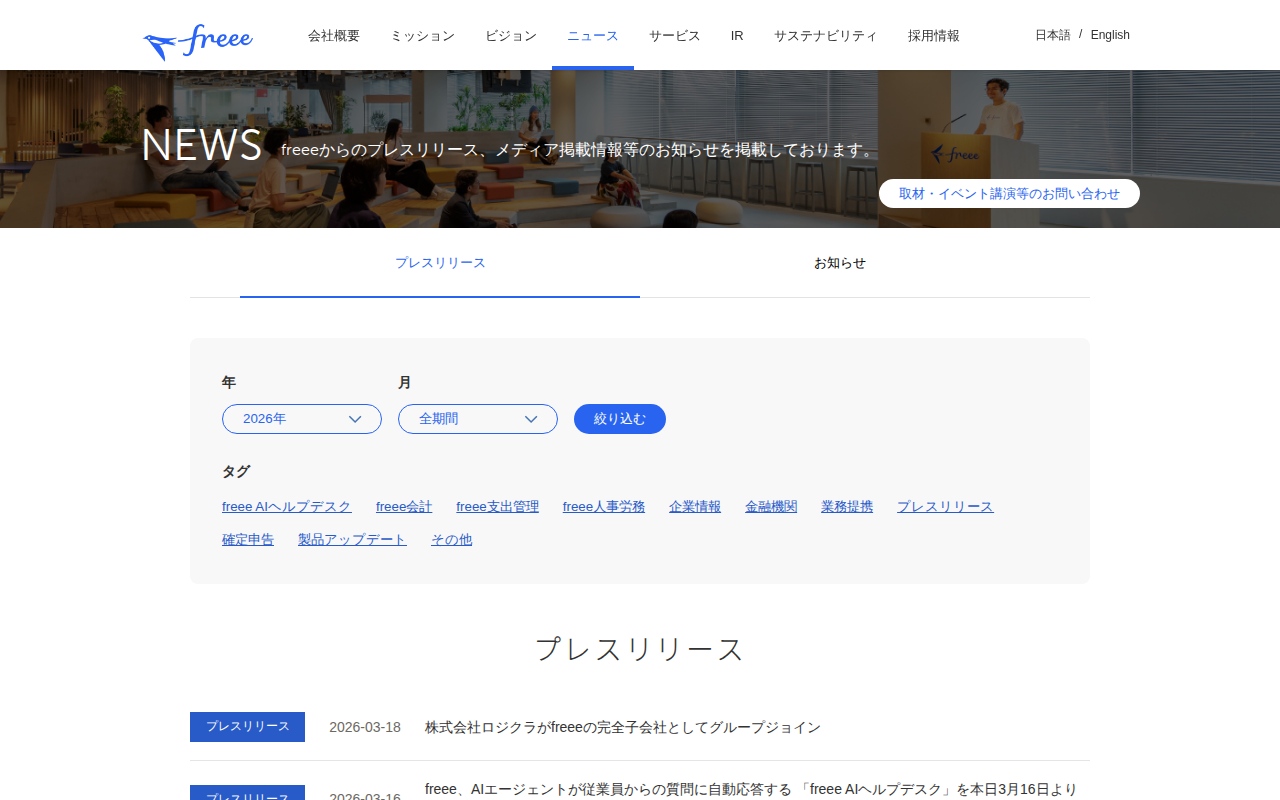 このページはフリー株式会社の2026年のプレスリリース一覧ページです。同社のニュース、プレスリリース、メディア掲載情報などを掲載しており、年月やタグで絞り込み検索が可能です。2026年3月のプレスリリ...