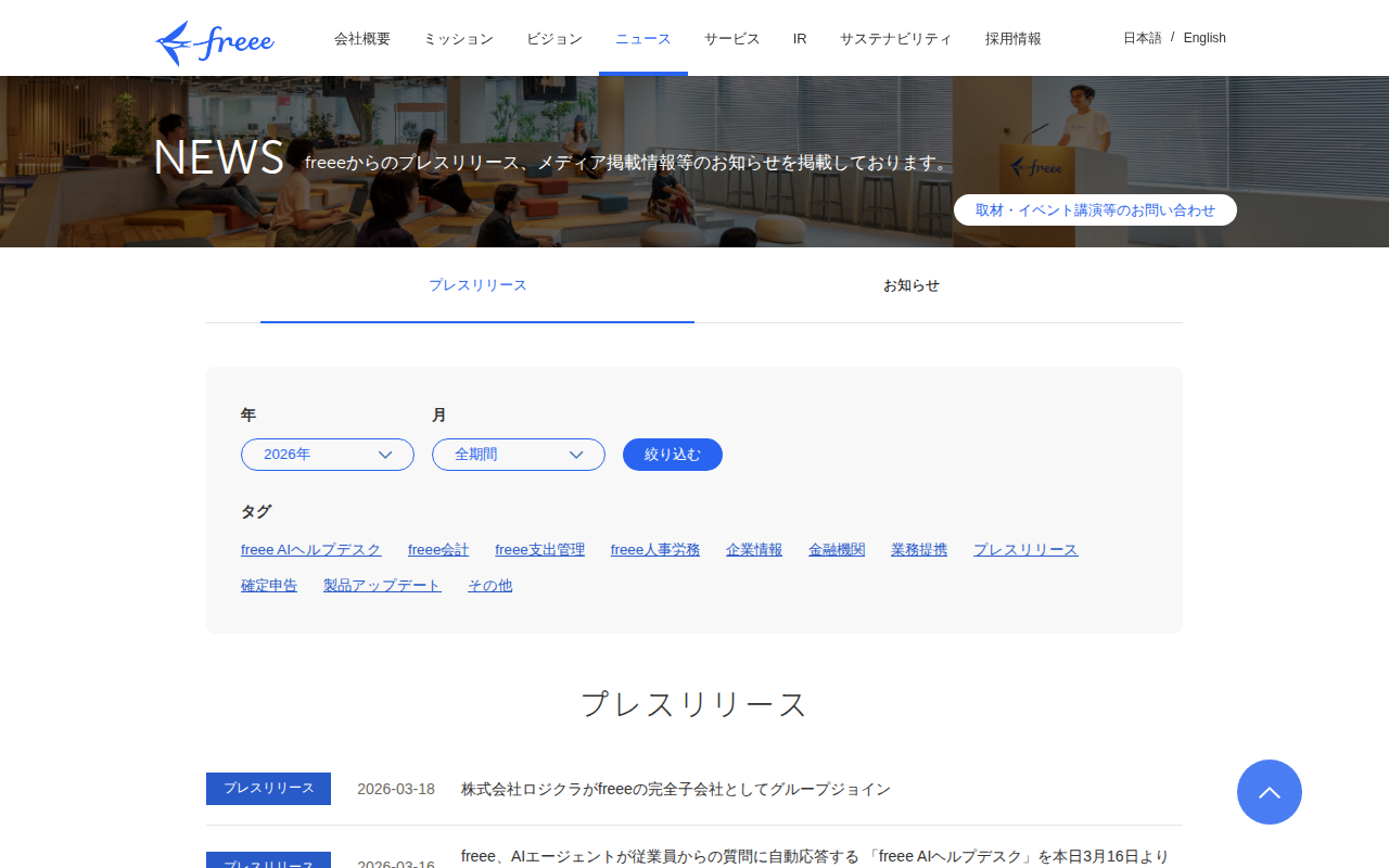 このページはフリー株式会社の2026年のプレスリリース一覧です。同社のニュース、プレスリリース、メディア掲載情報等を掲載しており、年月やタグで絞り込み検索できます。2026年3月の主なリリースには、ロ...