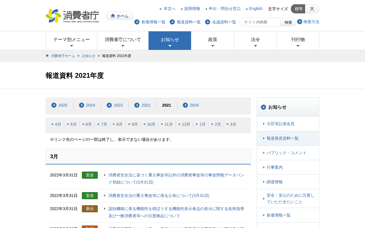 このページは、消費者庁の2021年度報道資料一覧ページです。2021年4月から2022年3月までの報道資料を月別に整理しており、安全、表示、制度、食品、会見などのテーマ別に分類されています。掲載内容は...
