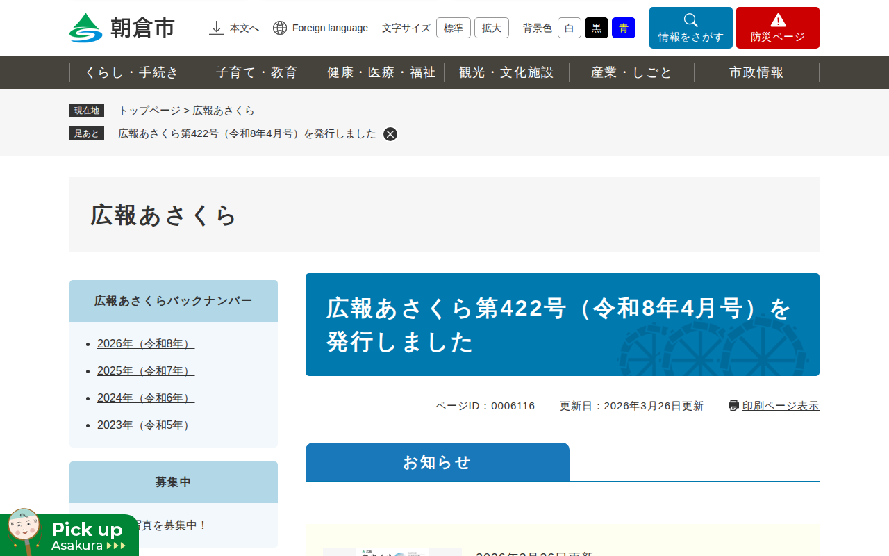 www.city.asakura.lg.jp/site/kohoのウェブアーカイブ(魚拓)です。 元のページが削除されても、保存されたスクリーンショットとHTMLで内容を確認できます。