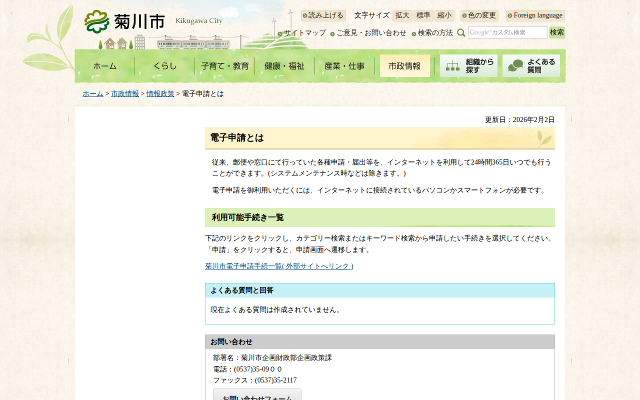 www.city.kikugawa.shizuoka.jp/hishokoho/e-shinsei2.htmlのウェブアーカイブ(魚拓)です。 元のページが削除されても、保存されたスクリーンショットとHTMLで内容を確認できます。