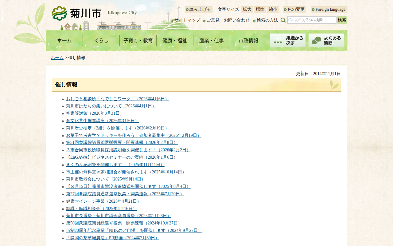 www.city.kikugawa.shizuoka.jp/moyooshi.htmlのウェブアーカイブ(魚拓)です。 元のページが削除されても、保存されたスクリーンショットとHTMLで内容を確認できます。