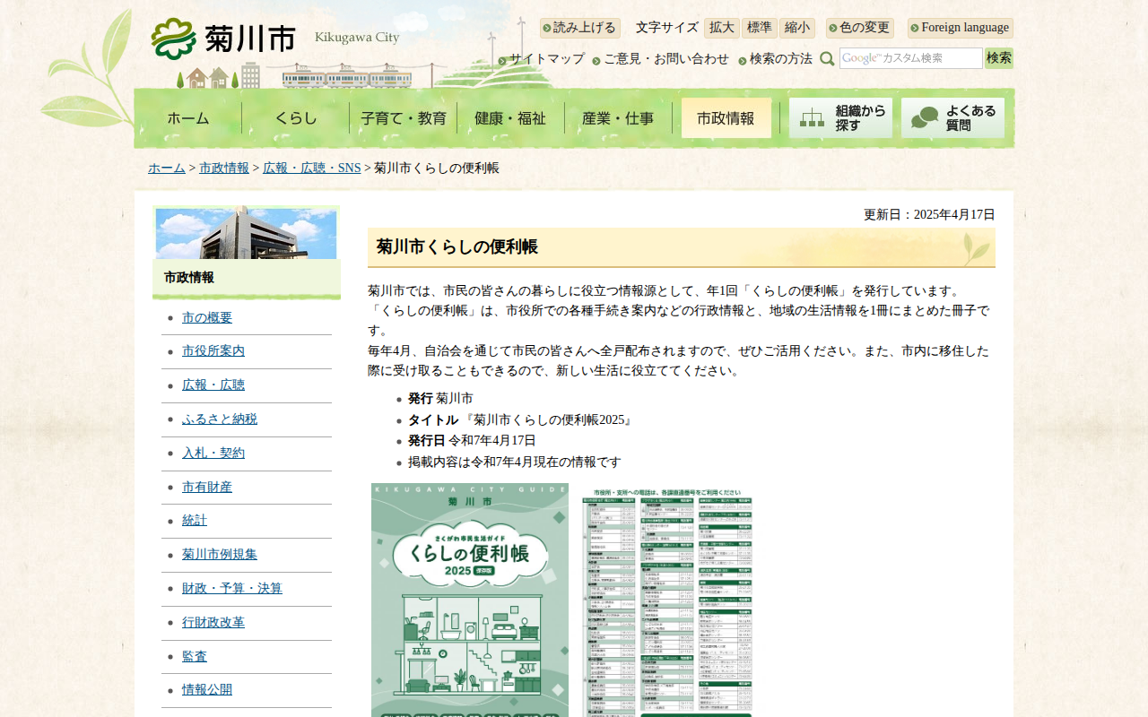 www.city.kikugawa.shizuoka.jp/shisei/kouhou/kurasinobenrichou.htmlのウェブアーカイブ(魚拓)です。 元のページが削除されても、保存されたスクリーンショットとHTMLで内容を確認できます。
