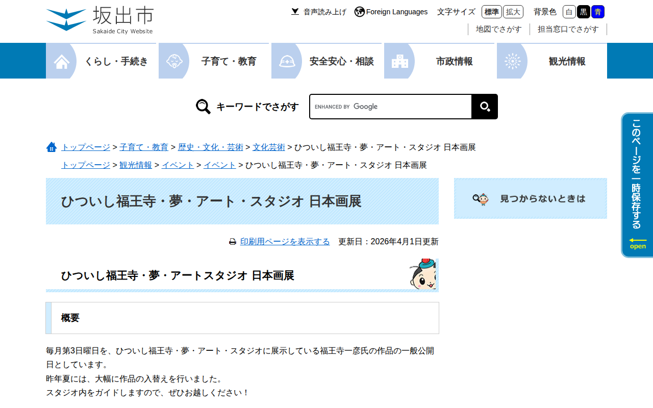 www.city.sakaide.lg.jp/soshiki/bunkashinkou/hitsuishi-fukuoji-nihongaten2025.htmlのウェブアーカイブ(魚拓)です。 元のページが削除されても、保存されたスクリーンショットとHTMLで内容を確認できます。