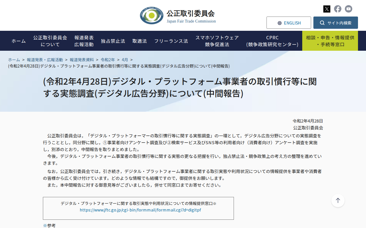 www.jftc.go.jp/houdou/pressrelease/2020/apr/200428_1.htmlのウェブアーカイブ(魚拓)です。 元のページが削除されても、保存されたスクリーンショットとHTMLで内容を確認できます。