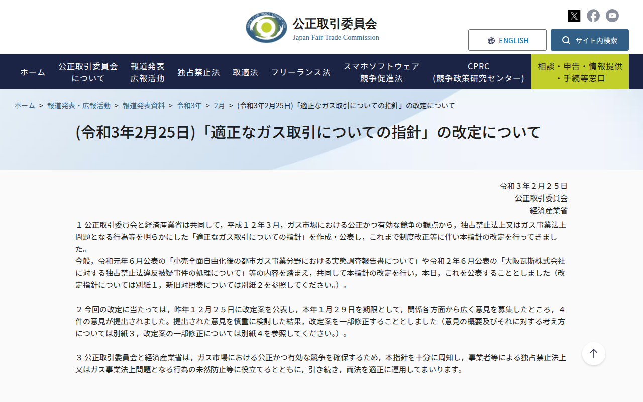 www.jftc.go.jp/houdou/pressrelease/2021/feb/210225_gasgl.htmlのウェブアーカイブ(魚拓)です。 元のページが削除されても、保存されたスクリーンショットとHTMLで内容を確認できます。