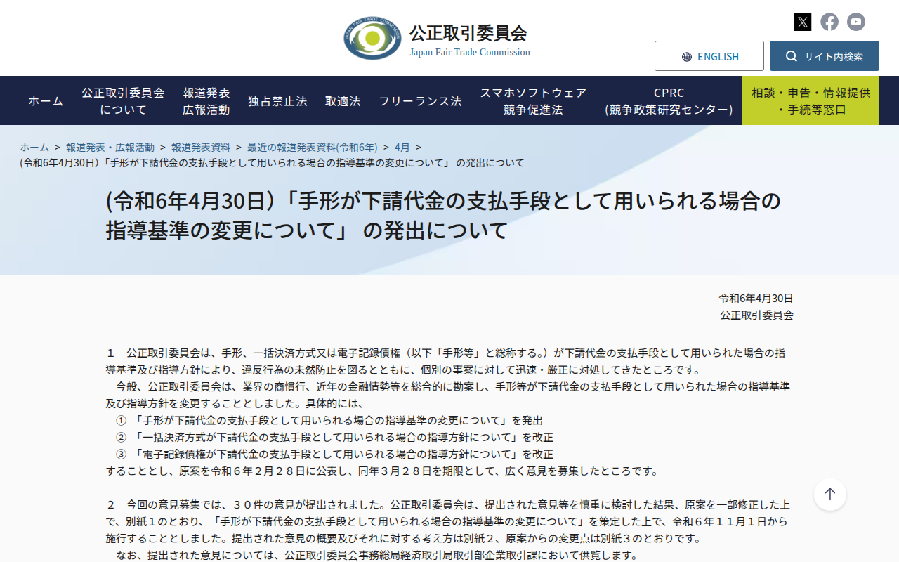 www.jftc.go.jp/houdou/pressrelease/2024/apr/240430_tegata.htmlのウェブアーカイブ(魚拓)です。 元のページが削除されても、保存されたスクリーンショットとHTMLで内容を確認できます。