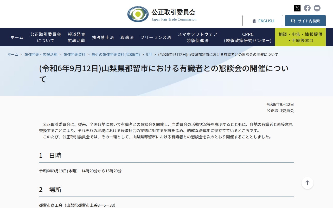 www.jftc.go.jp/houdou/pressrelease/2024/sep/240912_yamanashi_tsuru_kondan.htmlのウェブアーカイブ(魚拓)です。 元のページが削除されても、保存されたスクリーンショットとHTMLで内容を確認できます。