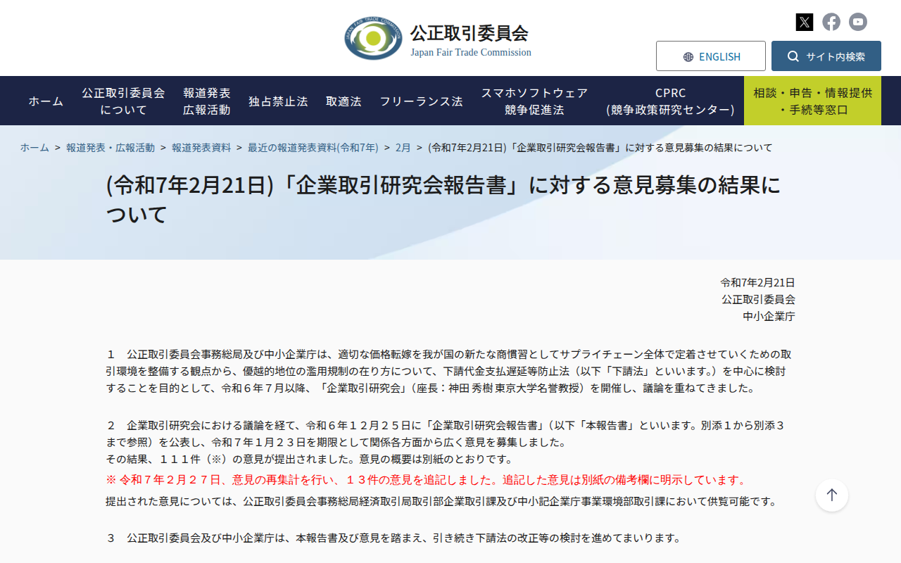 www.jftc.go.jp/houdou/pressrelease/2025/feb/250221_kigyotorihiki_iken.html