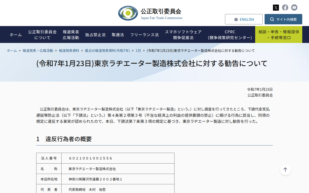 www.jftc.go.jp/houdou/pressrelease/2025/jan/250123_tokyoradiator.htmlのウェブアーカイブ(魚拓)です。 元のページが削除されても、保存されたスクリーンショットとHTMLで内容を確認できます。