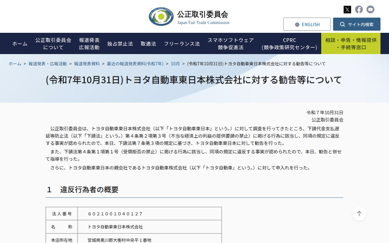 www.jftc.go.jp/houdou/pressrelease/2025/oct/251031_toyotajidousyahigashinihon.html