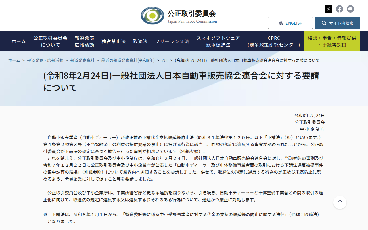 www.jftc.go.jp/houdou/pressrelease/2026/feb/260224_nihonjidousyahanbaikyoukai.htmlのウェブアーカイブ(魚拓)です。 元のページが削除されても、保存されたスクリーンショットとHTMLで内容を確認できます。