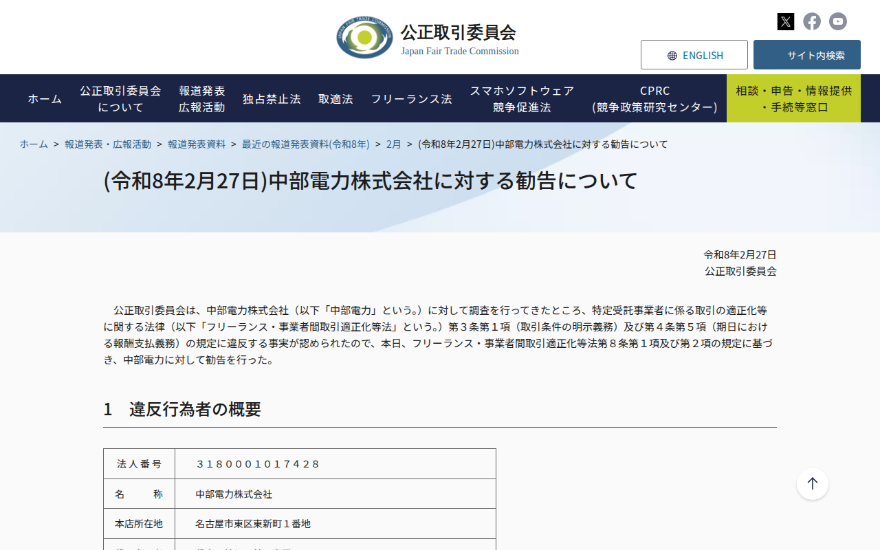 www.jftc.go.jp/houdou/pressrelease/2026/feb/260227_flchubu.htmlのウェブアーカイブ(魚拓)です。 元のページが削除されても、保存されたスクリーンショットとHTMLで内容を確認できます。