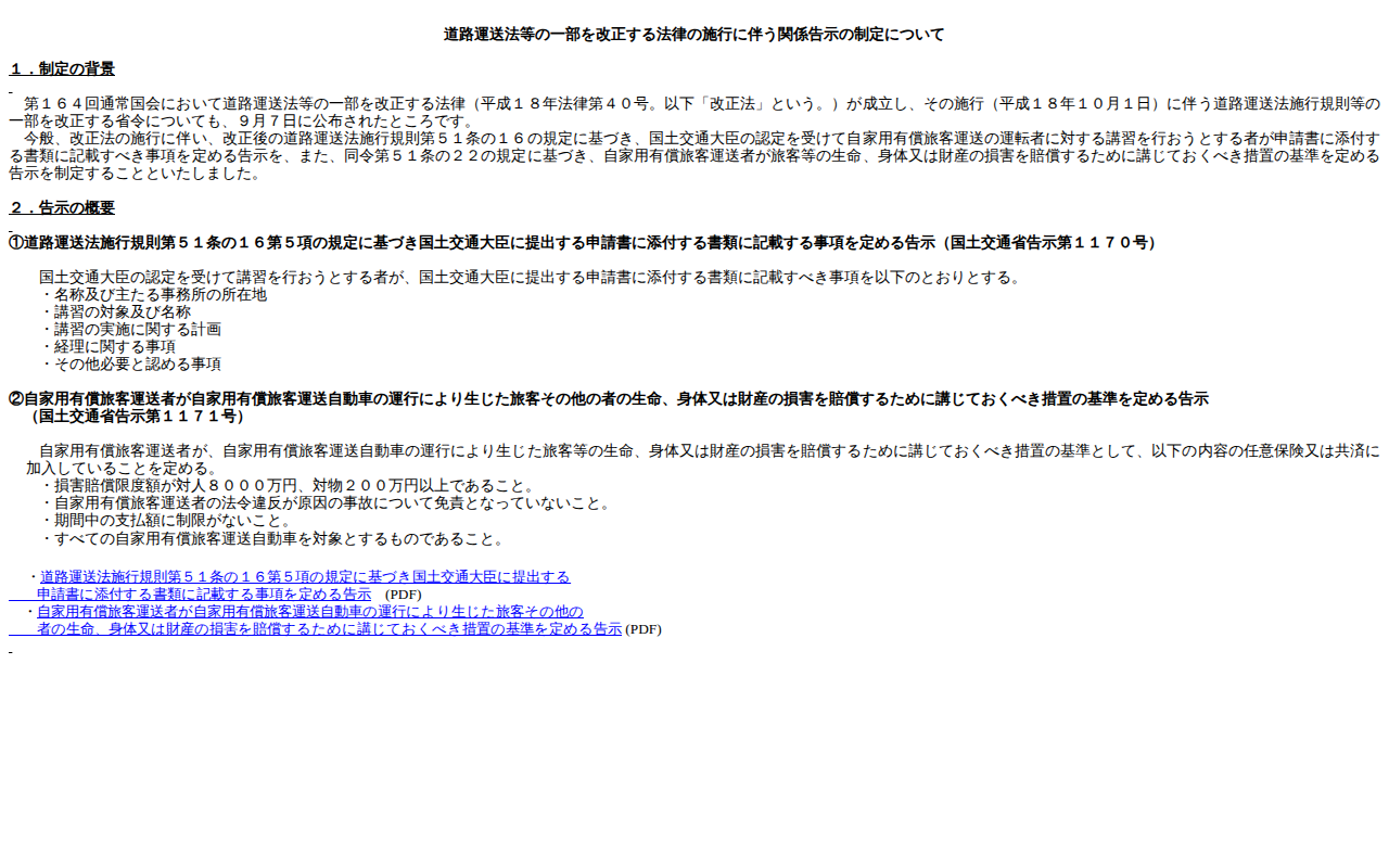 www.mlit.go.jp/jidosha/sesaku/jigyo/jikayouyushoryokaku/kokuji.htmのウェブアーカイブ(魚拓)です。 元のページが削除されても、保存されたスクリーンショットとHTMLで内容を確認できます。