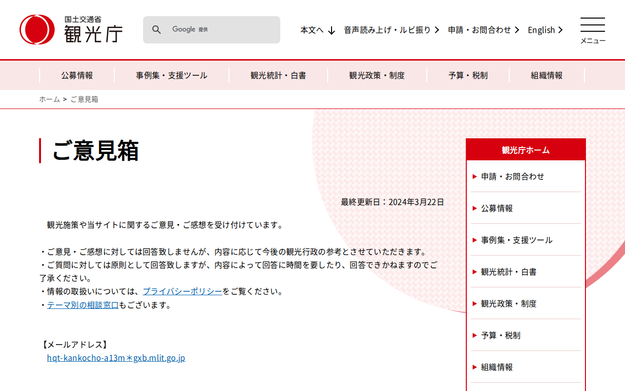 www.mlit.go.jp/kankocho/concierge/goiken.html