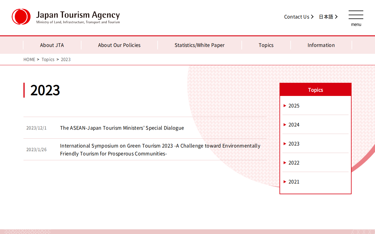 www.mlit.go.jp/kankocho/en/kouhou/topics_2023.htmlのウェブアーカイブ(魚拓)です。 元のページが削除されても、保存されたスクリーンショットとHTMLで内容を確認できます。