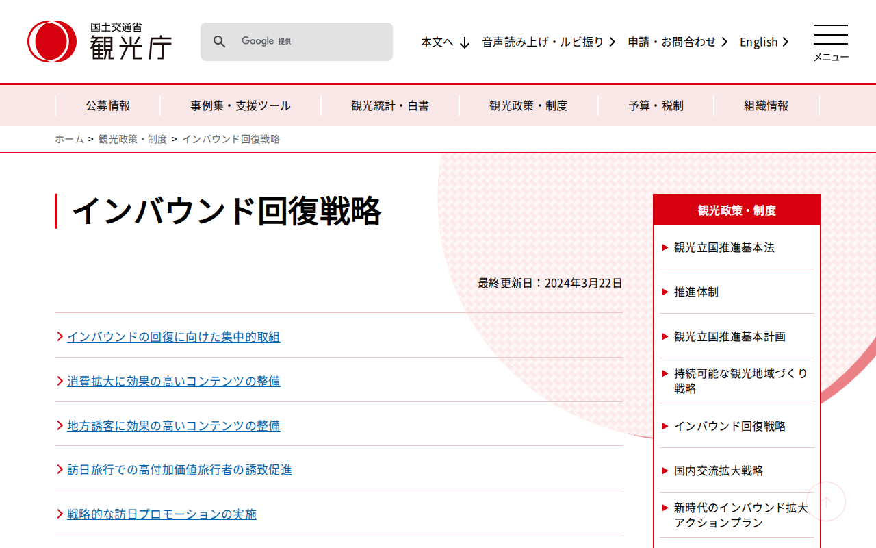 www.mlit.go.jp/kankocho/seisaku_seido/kihonkeikaku/inbound_kaifuku/index.htmlのウェブアーカイブ(魚拓)です。 元のページが削除されても、保存されたスクリーンショットとHTMLで内容を確認できます。