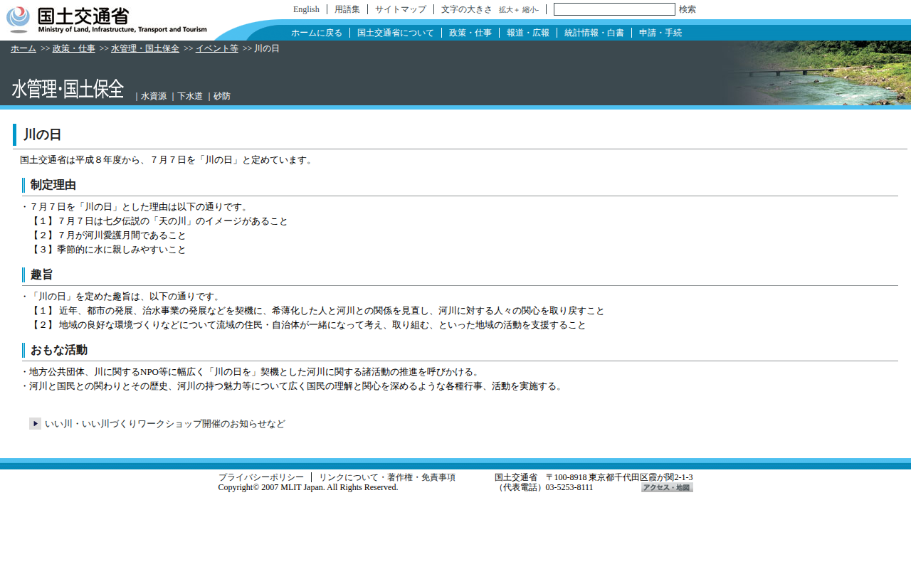 www.mlit.go.jp/river/kasen/campaign/kawa/kawanohi/index.htmlのウェブアーカイブ(魚拓)です。 元のページが削除されても、保存されたスクリーンショットとHTMLで内容を確認できます。