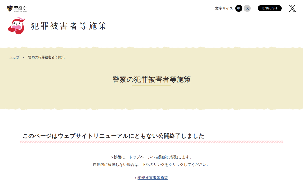www.npa.go.jp/higaisya/home.htmのウェブアーカイブ(魚拓)です。 元のページが削除されても、保存されたスクリーンショットとHTMLで内容を確認できます。