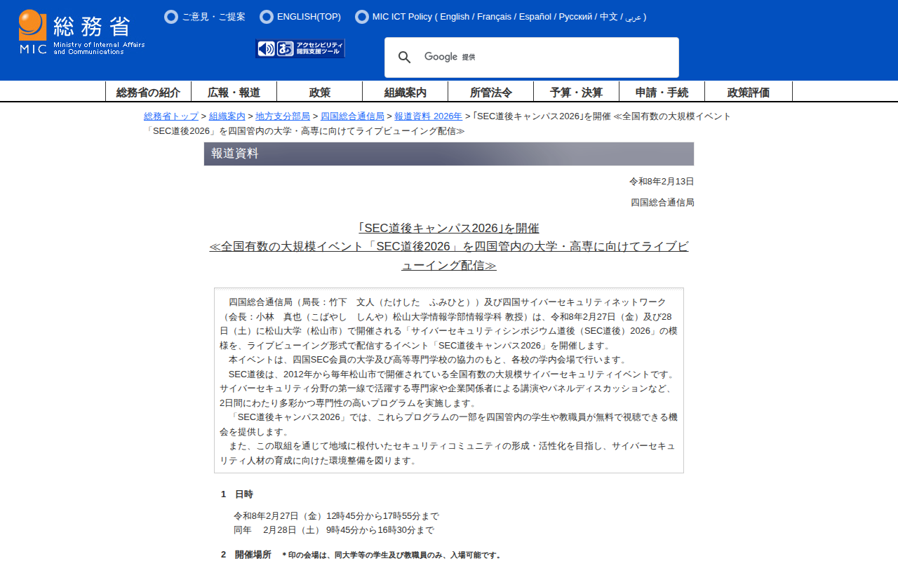 www.soumu.go.jp/soutsu/shikoku/press/20260213.htmlのウェブアーカイブ(魚拓)です。 元のページが削除されても、保存されたスクリーンショットとHTMLで内容を確認できます。